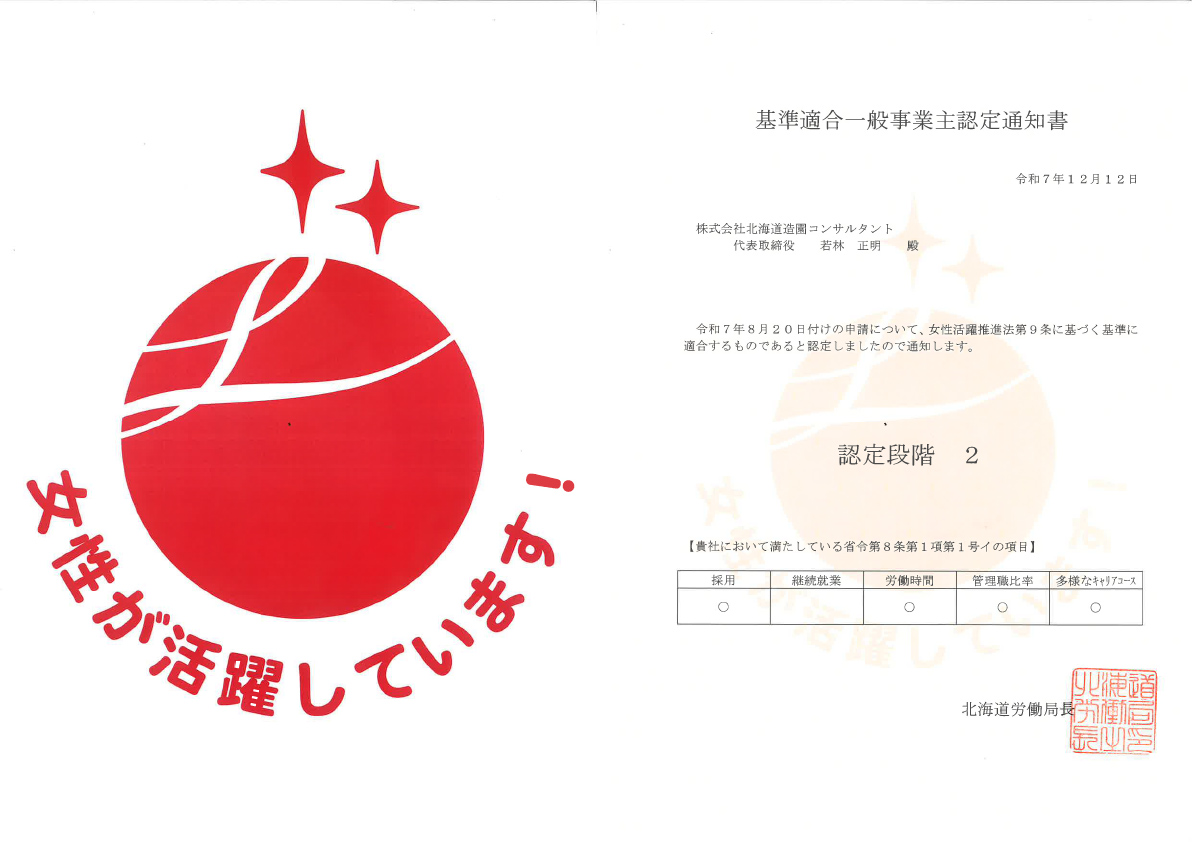 採用されてから仕事をする上で女性が能力を発揮しやすい職場環境であるという観点から5つの評価項目のうち採用、労働時間等の働き方、管理職比率、多様なキャリアコースの4つが認定されました